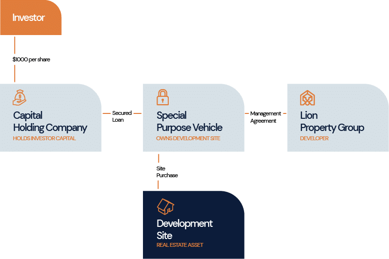 The capital-holding company then provides the capital to the SPV via a secured loan agreement, with the loaned amount being secured against the assets of the SPV, which is the development site. The interest repayments that the SPV makes on the loaned capital is what comprises the investors’ returns.